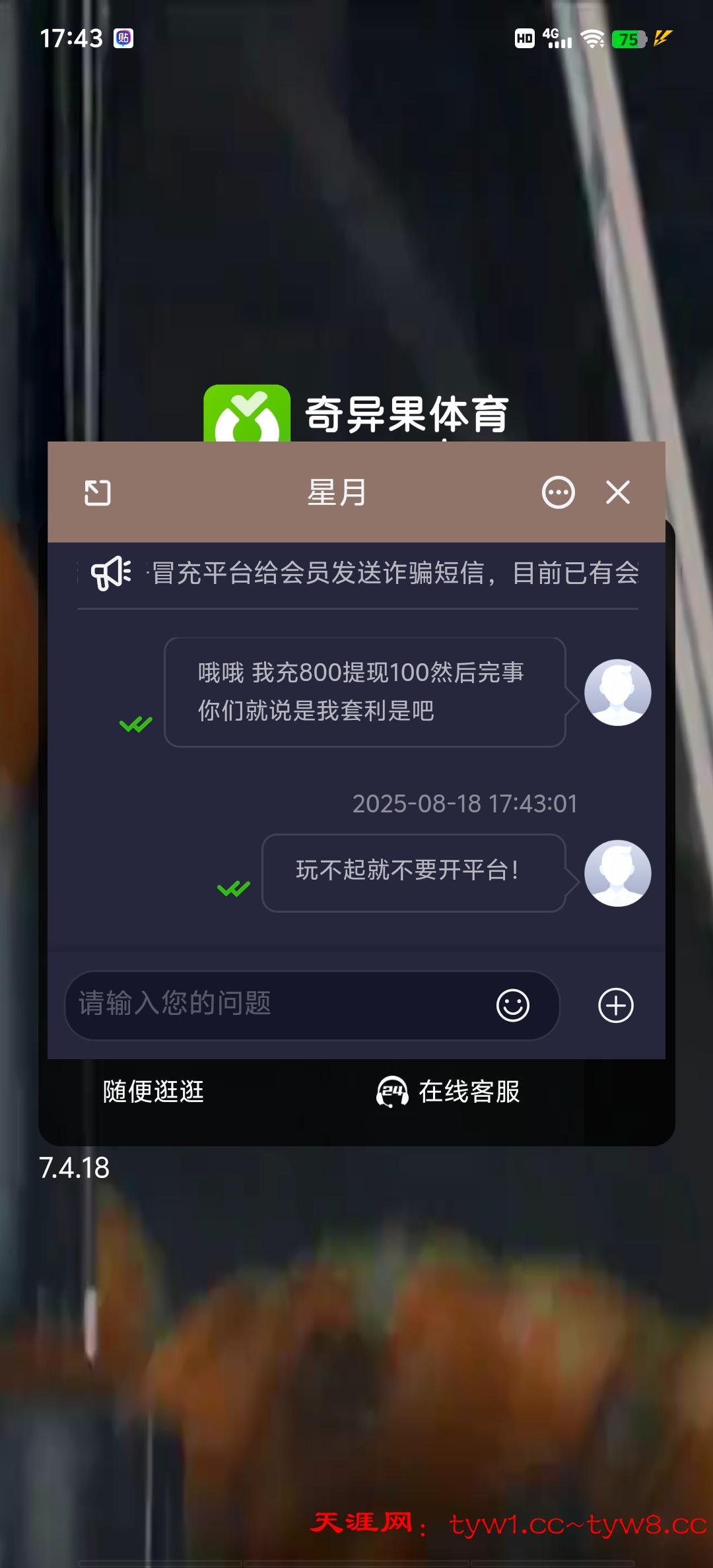 奇异果体育 玩了3天 一共充值800 最后一天充值200 提现100 直接给我账号封禁 说我套利