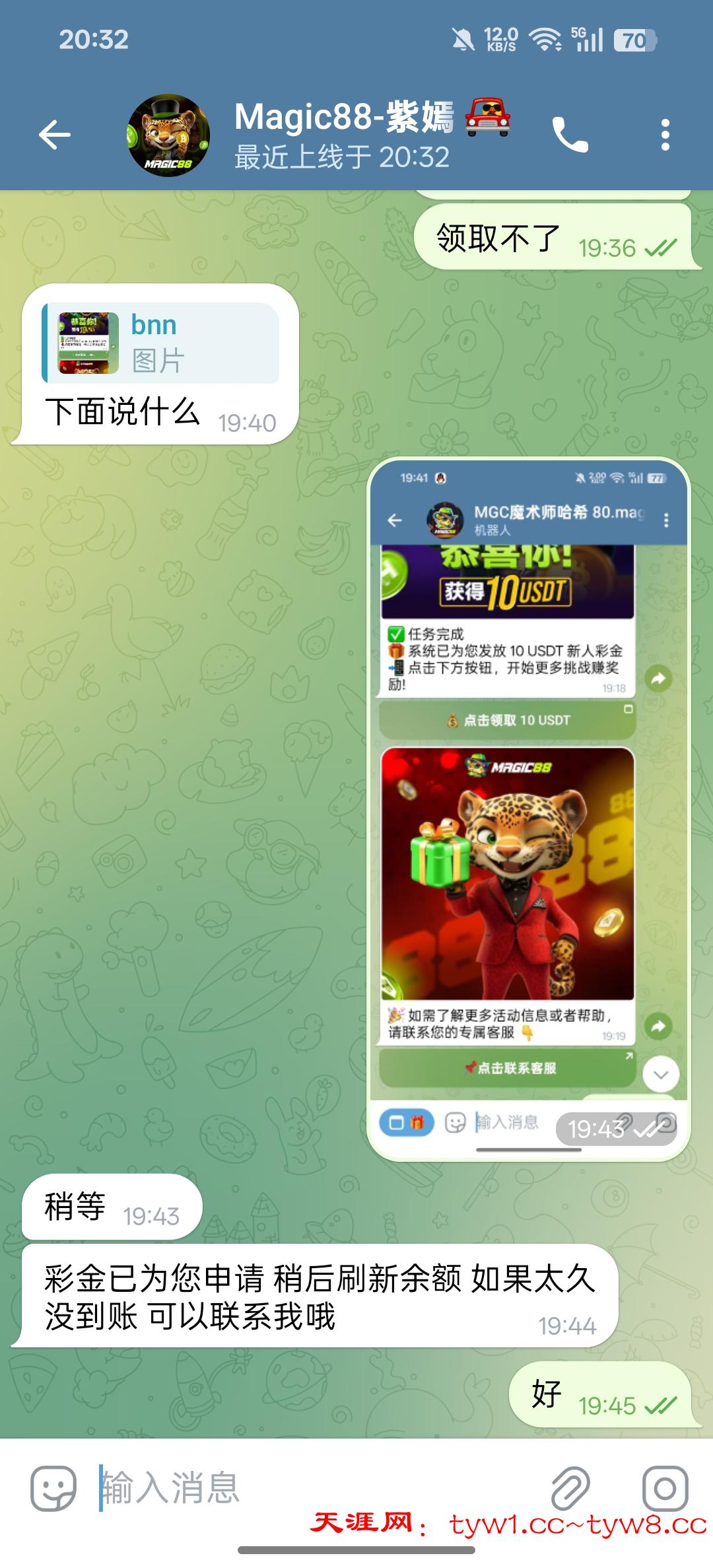 拉自己小号关注机器人加入群组就可以领取10u,没到联系客服叫她添加就行,彩金最多提10u