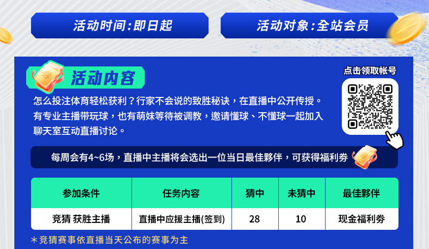 加入聊天室,参加体育争霸赛,猜获胜主播