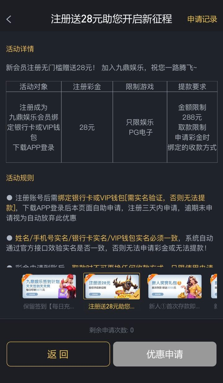 新用户注册下载app并绑定银行卡或者钱包 去优惠活动那自助申请 审核时间1-15分钟 彩金只能玩PG电子 盈利至288可以提现