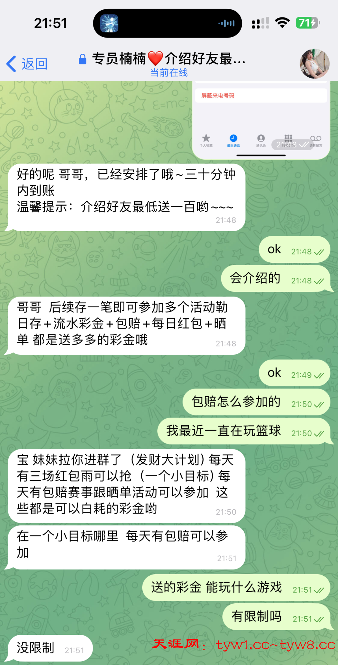 接到电话说送 彩金 找在线客服 让加的专属客服 没问我要手机号 直接发的账号 愿意碰的可以碰一下 我打到 100 提现了 目前还没到账