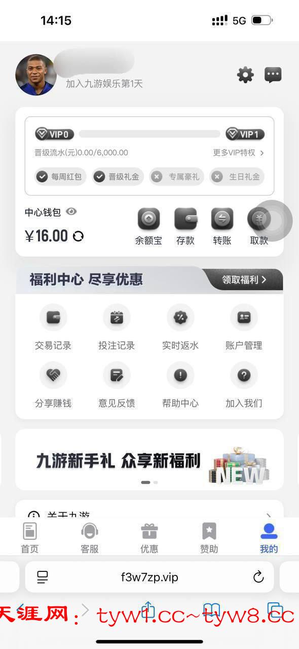 新人完善账户彩金 送16新用户注册绑卡绑定手机号,福利中心自助领取,这个系列看脸,几率下款,有没注册的兄弟去试试吧!