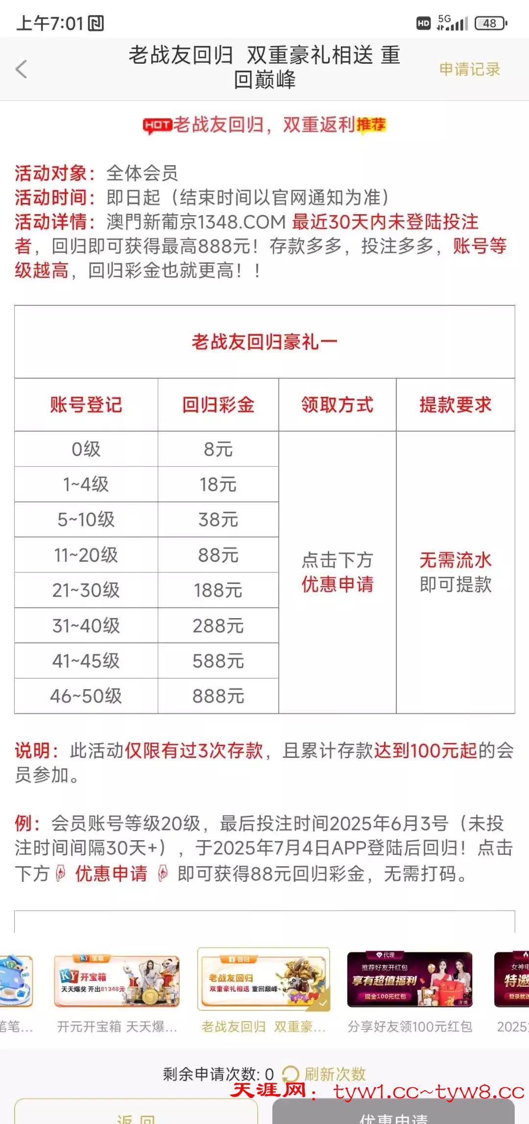 此活动仅限有过3次存款,且累计存款达到100元起的会员参加。