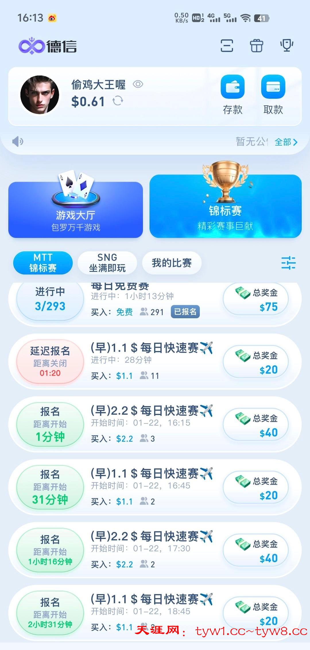 这个每天有四场免费赛,12点,3点,6点,9点,只要打出够1.1u,就去打每日快速赛1.1,2.2的比赛这个基本没什么人报名玩,最多10人进,只要稳一点基本可以吃前三名,够50u就可以提了,我打了两天已经到账50,白嫖即可不要充值官网DX.vip