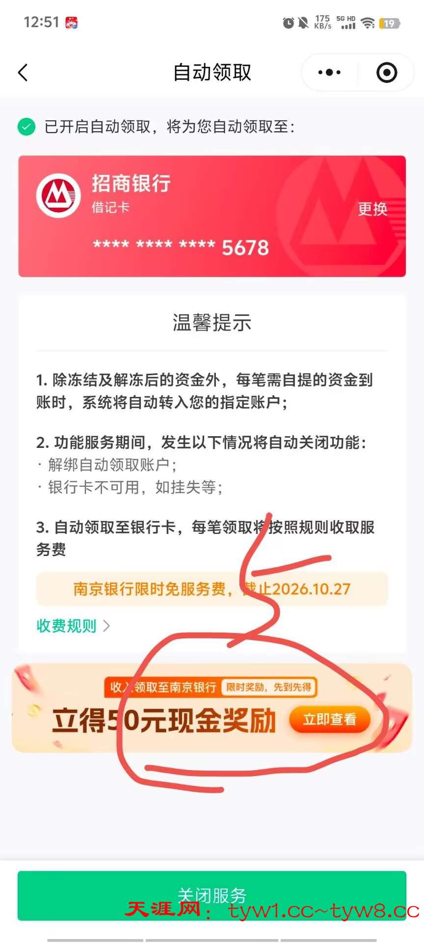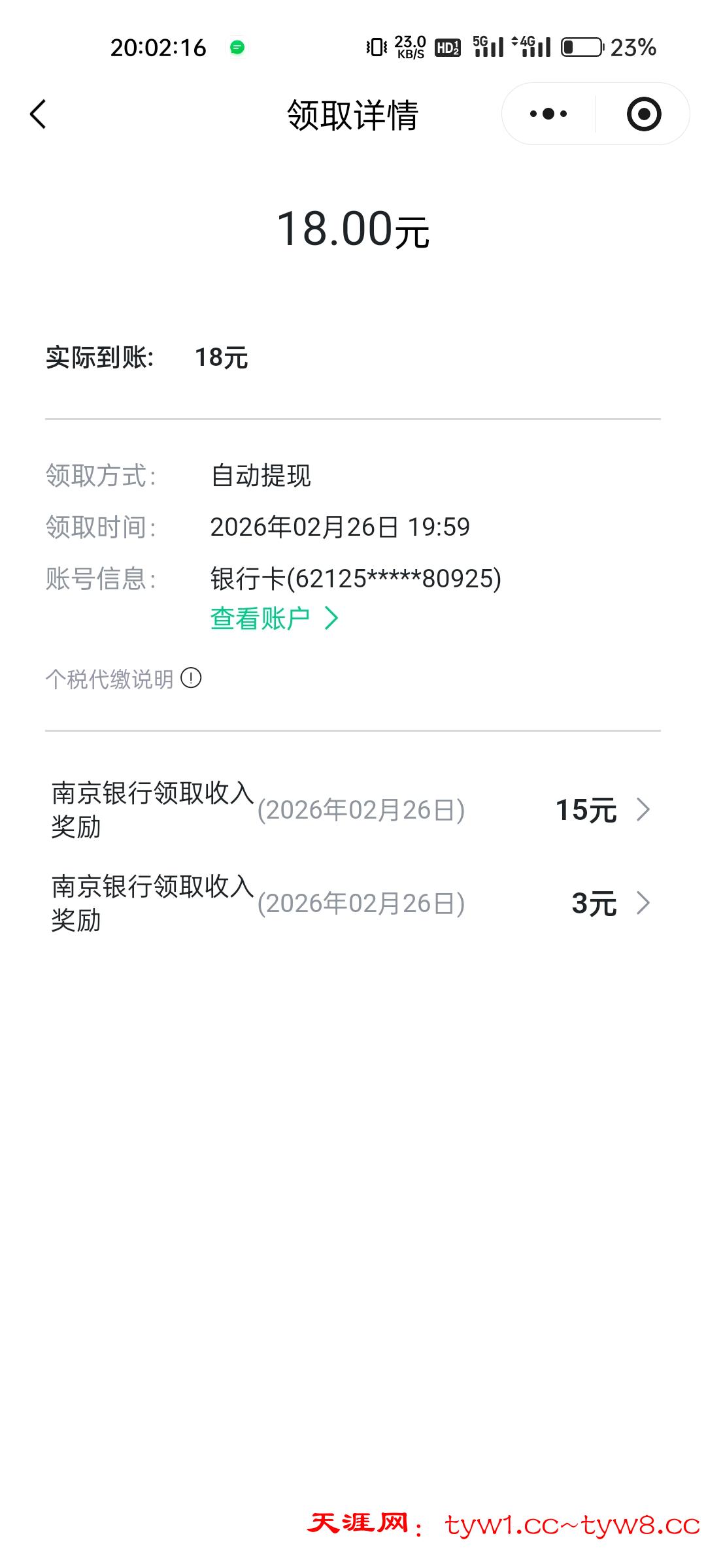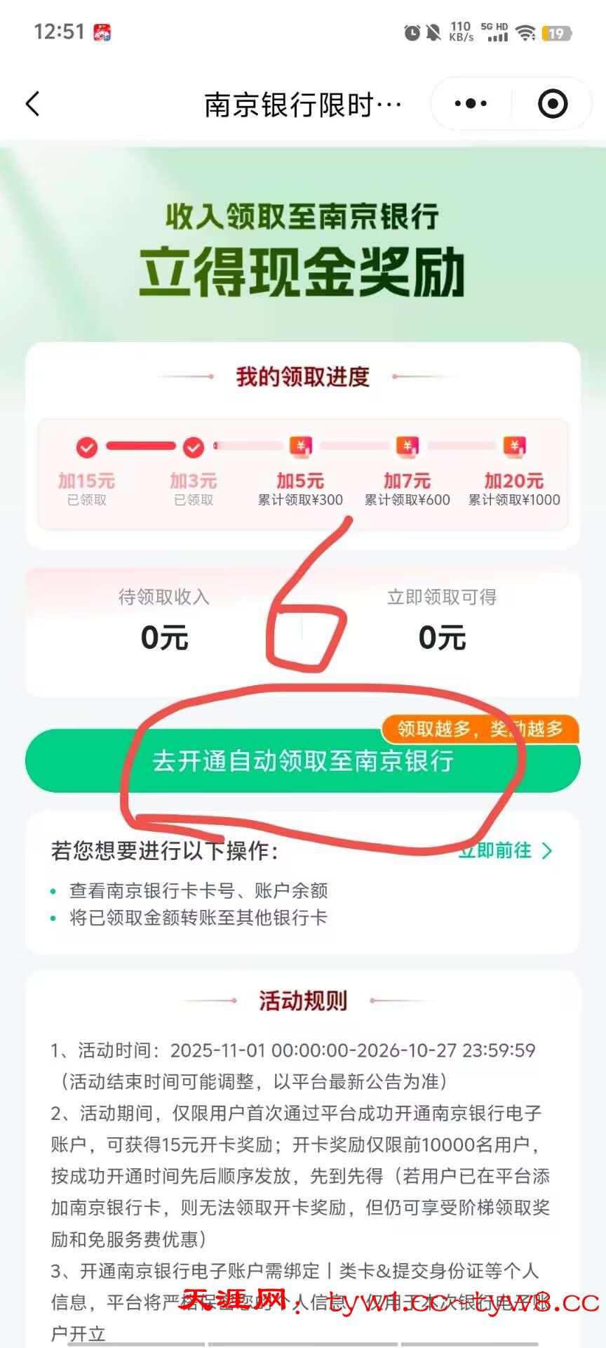 2:下面是教程点我的页面,点待领取进去,点开启自动领取,出来这个页面点开户就行了(自动领取页面一开始没有入口显示,南京银行收入奖励的等半个小时左右再刷新进去就会显示啦)到账啦直接绑定微信提现,不用下载