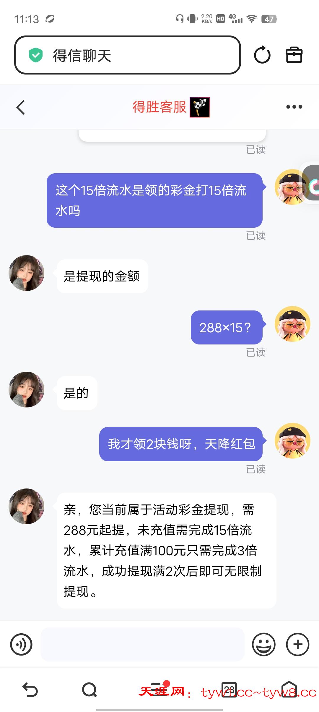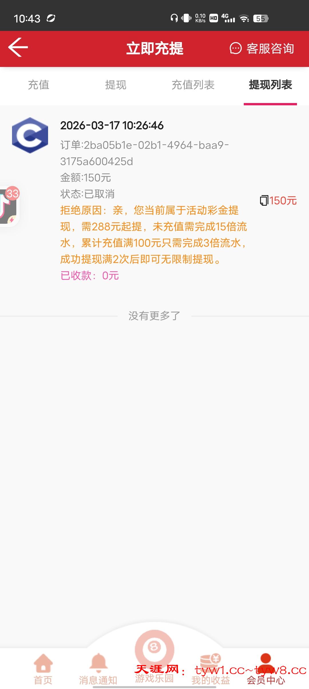 注册领了2块天降红包,提150不给提,打到288也提不了,领2块钱,要打288×15等于4300多流水,