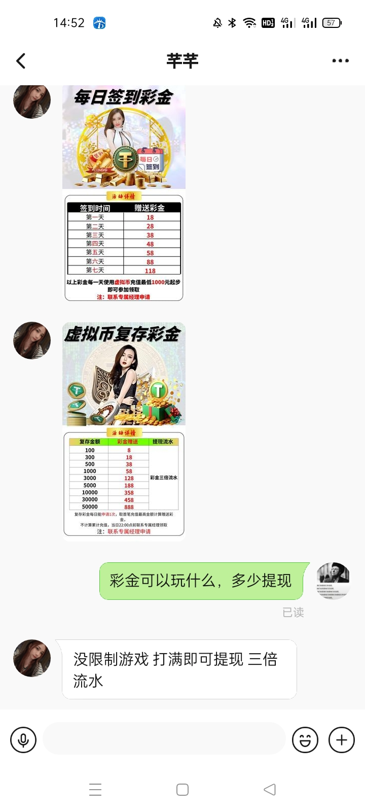 我是接到电话去的,找在线客服直接说电话彩金,客服直接叫你加旺旺,大家可以去碰一下