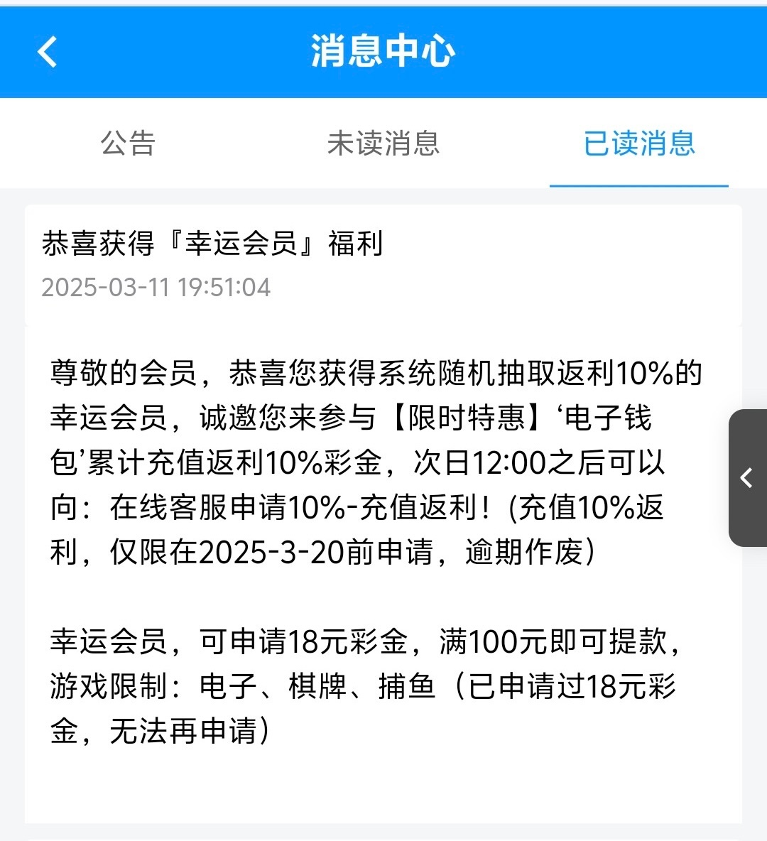 有号的老哥可以上号看看站内信有没有,有的话可以去联系客服申请18彩金,限电子棋牌捕鱼,满100提现