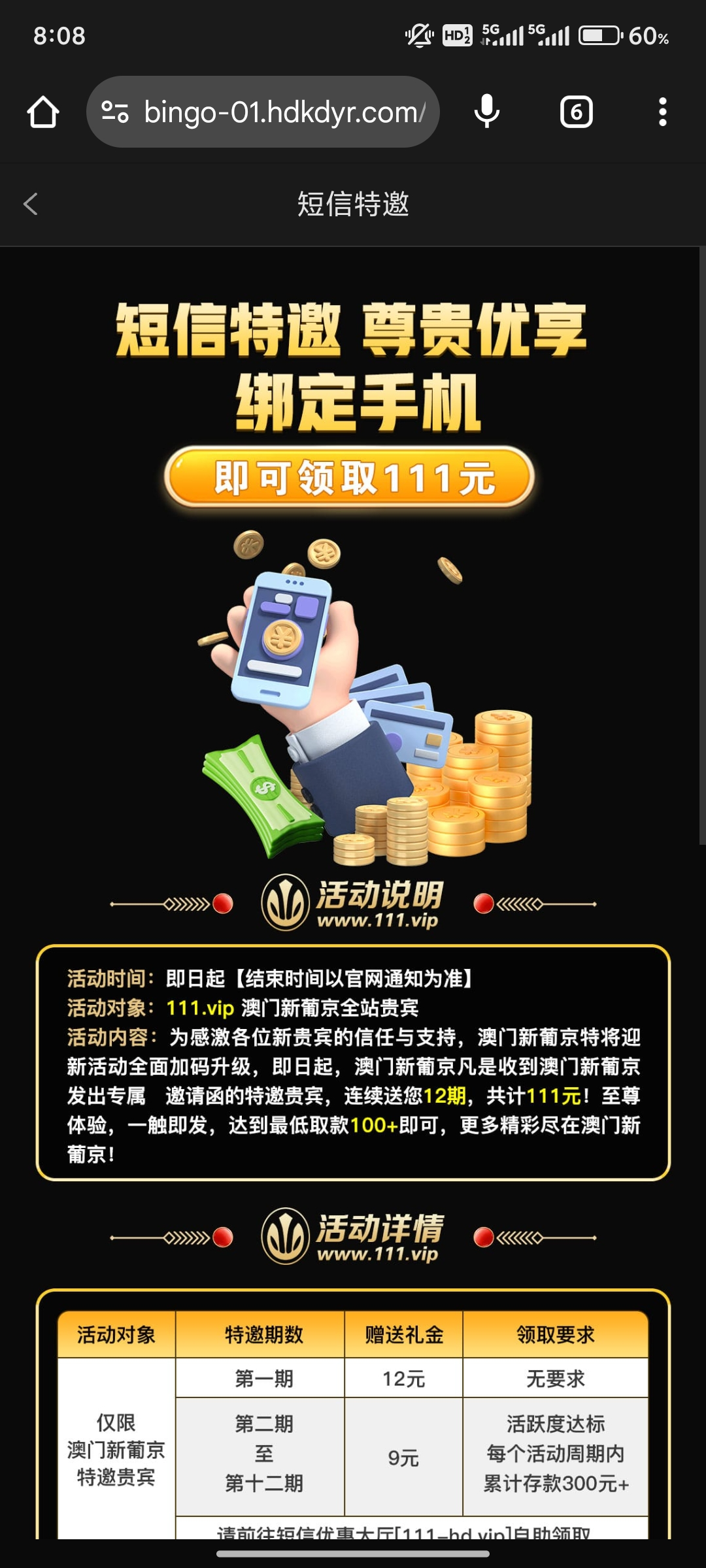 您好,很抱歉~我司短信特邀活动贵宾名额已满,请您自行进入平台优惠活动栏目处,即可查看其他相关优惠详情,多多豪礼等您领取哦,谢谢!