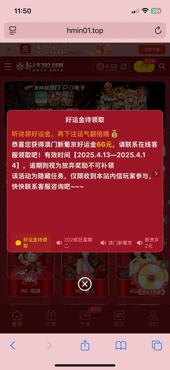澳门新葡京2024.13-4.14回馈彩金202.com老用户有号上号登录 看站内信是否收到邮件,收到联系在线客服领取16彩金,彩金限制领到以后询问客服!