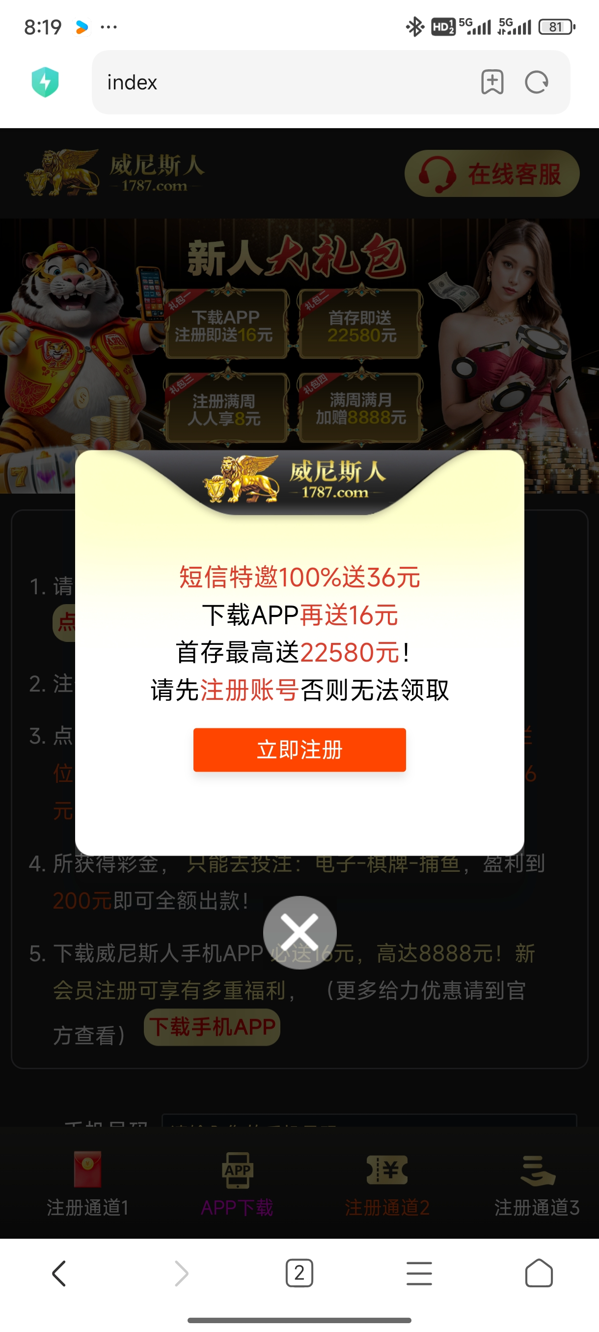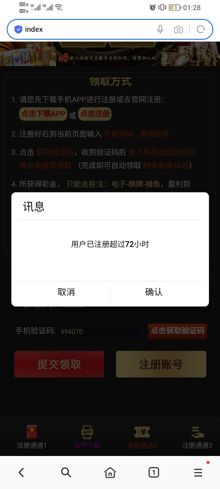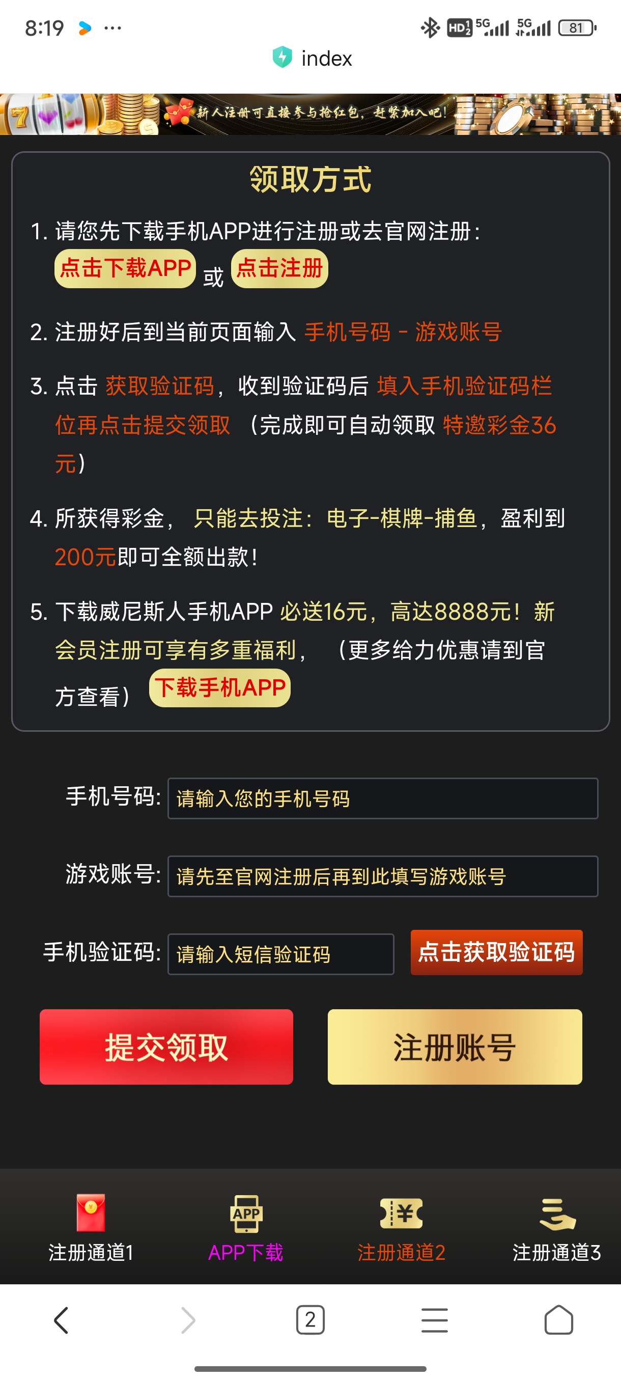 然后点击立即注册,不用绑卡注册完账号重新打开020.vip输入手机号账号去碰瓷送36,下载APP送16直接提现,也可以玩以大博小,存16送28彩金,200提现,只能电子,提款老哥给个猪脚饭,速去