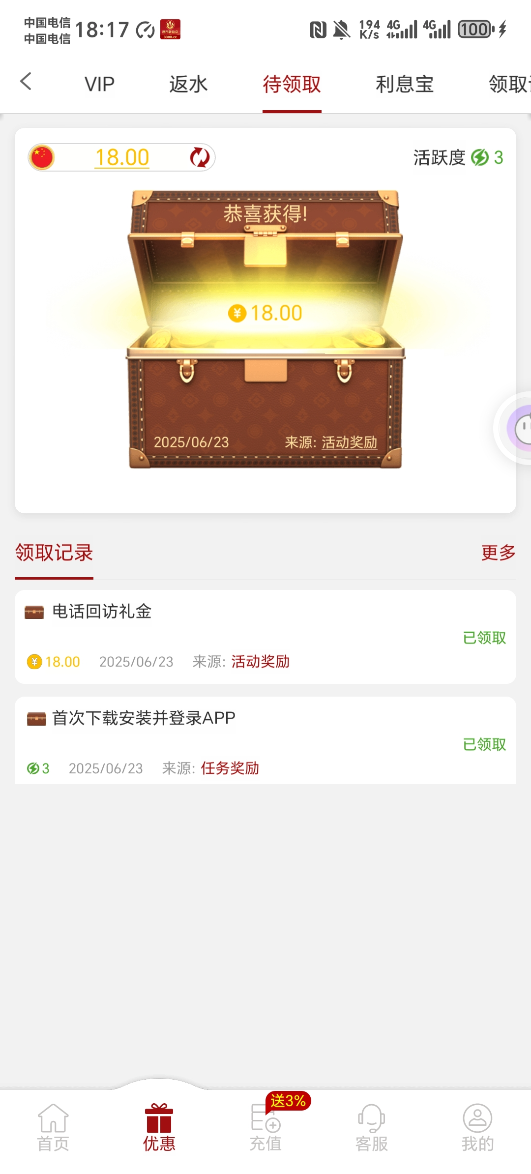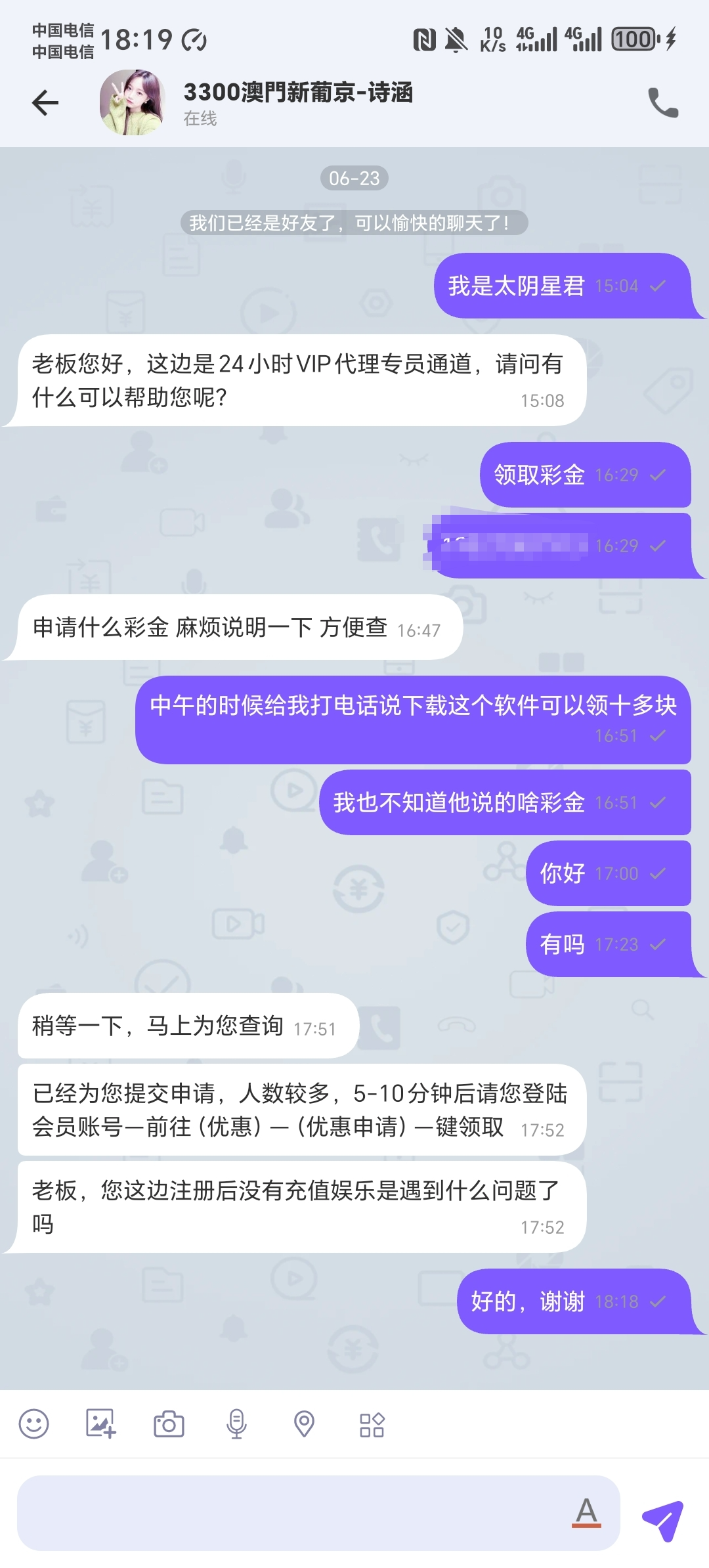 我是昨天注册,今天打电话让我下载聊天软件找客服领18,可以去碰一下